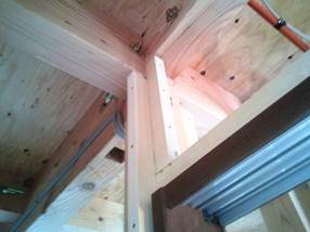 部屋の入り隅になる所にボードが貼れるように垂木を打ちつけます。本来ならば天井になる高さより少し伸ばしておけば事足りますが