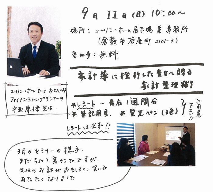 9月は、ユーリン・ホームではおなじみの先生、ファイナンシャルプランナーの中西先生をお迎えして、家計整理術のお勉強です。