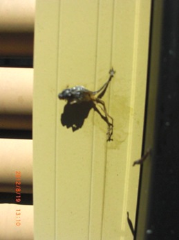 メダカ池のホテイアオイの葉からコンクリート塀に飛び移り