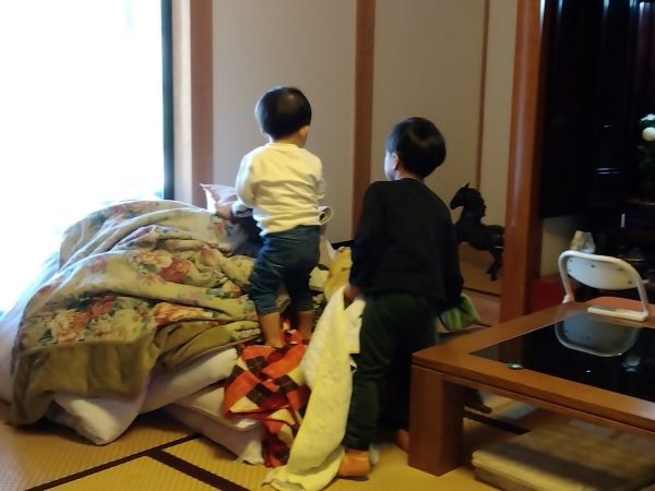 写真は2人でお布団をひたすら積み上げ、秘密基地を作っている所。
