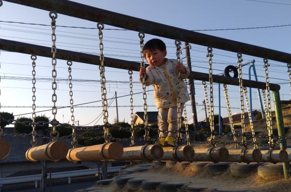 11月だったかに来たときは、揺れる丸太の遊具が怖くて渡れなかったのに、しがみつきつつ、一歩一歩着実に渡ることができました!